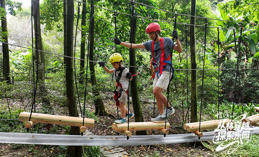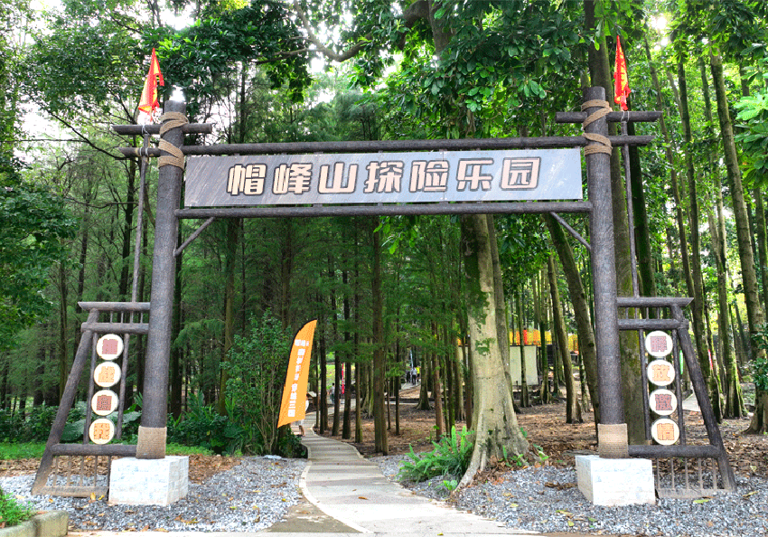 在帽峰山森林景區(qū)的茂密林間,三國旌旗林立,一條蜿蜒的“冒險脈絡(luò)”正悄然生長——游玩挑戰(zhàn)設(shè)施錯落分布于原生樹木之間,這里沒有鋼筋水泥的“人造樂園”,只有藤蔓纏繞的各類步道、藏在樹杈間的趣味蹦網(wǎng)和懸掛在樹木間的溜索……