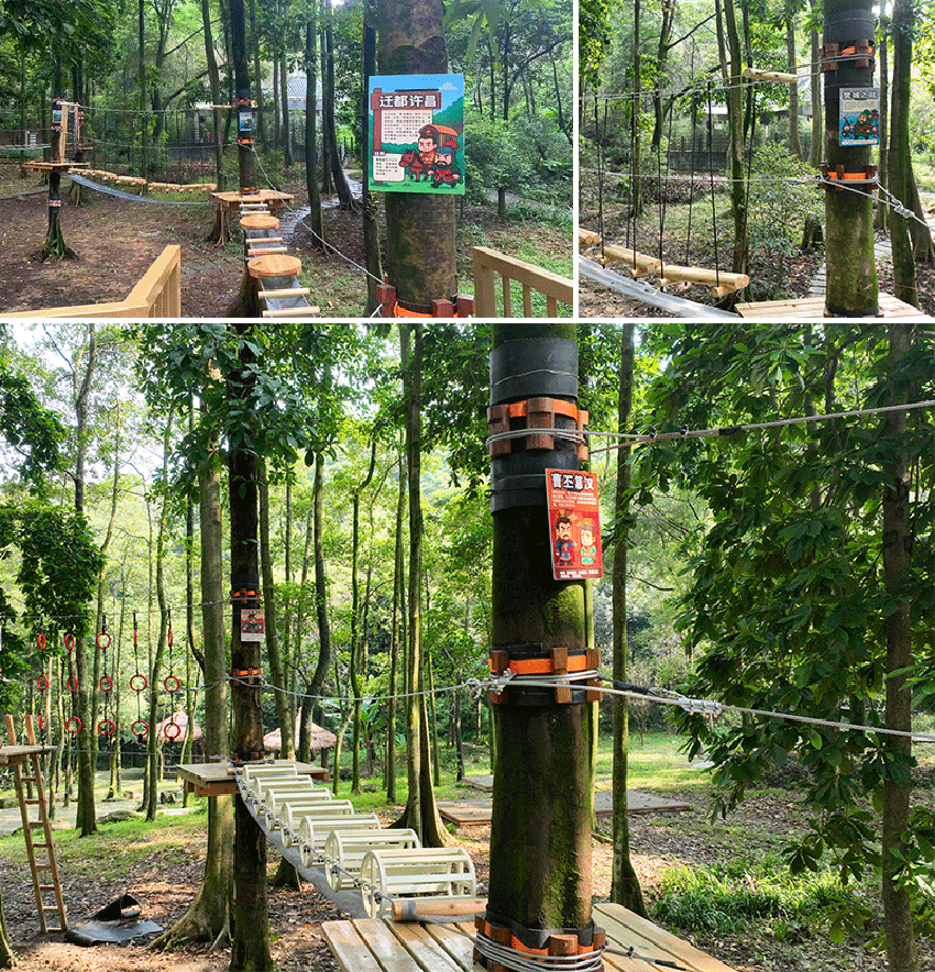 根據(jù)現(xiàn)場環(huán)境來設(shè)計線路及設(shè)施,在不破壞原有環(huán)境的基礎(chǔ)上,充分利用樹木來作為支撐,確保項目自然、和諧。