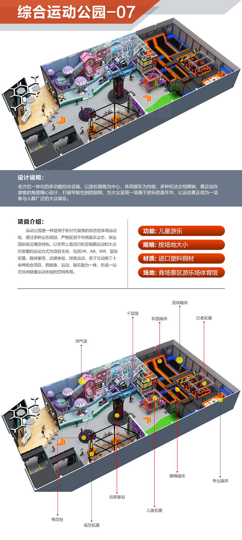 本項目適用于各種親子主題類的樂園,巧妙運用“熊貓”IP造型設計,集拓展、探險、滑道、飛索、蹦極、不銹鋼滑梯、攀巖、爬網等46種不同運動體驗的文化主題項目,結合“大灰熊”IP形象,融入相關設計元素,打造差異化的網紅IP主題性運動拓展營地綜合體。 在裝飾設計上采用竹葉和竹竿的綠色設計元素,以原生態、自然風格為基調,采用原木、繩網和不銹鋼等柔韌度好的生態材料。滿足大眾貼近自然、主題鮮明、寓教于樂的兒童素質訓練教育親子樂園的精神訴求。