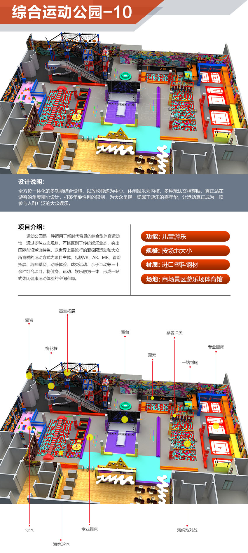 本項目適用于各種親子主題類的樂園,巧妙運用“熊貓”IP造型設計,集拓展、探險、滑道、飛索、蹦極、不銹鋼滑梯、攀巖、爬網等46種不同運動體驗的文化主題項目,結合“大灰熊”IP形象,融入相關設計元素,打造差異化的網紅IP主題性運動拓展營地綜合體。 在裝飾設計上采用竹葉和竹竿的綠色設計元素,以原生態、自然風格為基調,采用原木、繩網和不銹鋼等柔韌度好的生態材料。滿足大眾貼近自然、主題鮮明、寓教于樂的兒童素質訓練教育親子樂園的精神訴求。