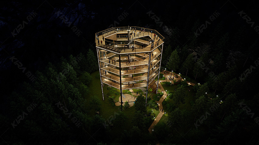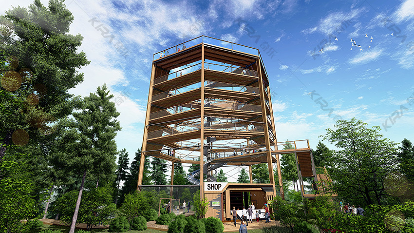 1、塔長23米,寬23米,高25米,由八根立柱圍合成正八邊形; 2、售票處位于塔體外側,并設有鋼構樓梯,上行8米到達一層平臺; 3、一層平臺往上可通過螺旋木棧道到達塔頂,棧道分五層,每層高三米; 4、一層平臺處設有旋轉滑梯,可劃至塔底,滑梯直徑0.95米,總長33米; 5、底層設有臨時商店,可為游客提供簡易餐飲; 6、出入口進行分流設計,避免擁堵,給游客營造一個良好的游玩環境,也方便景區管理。