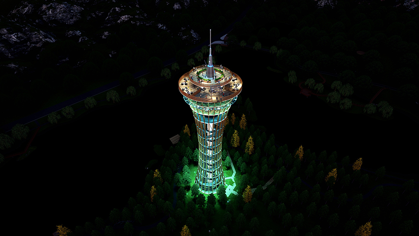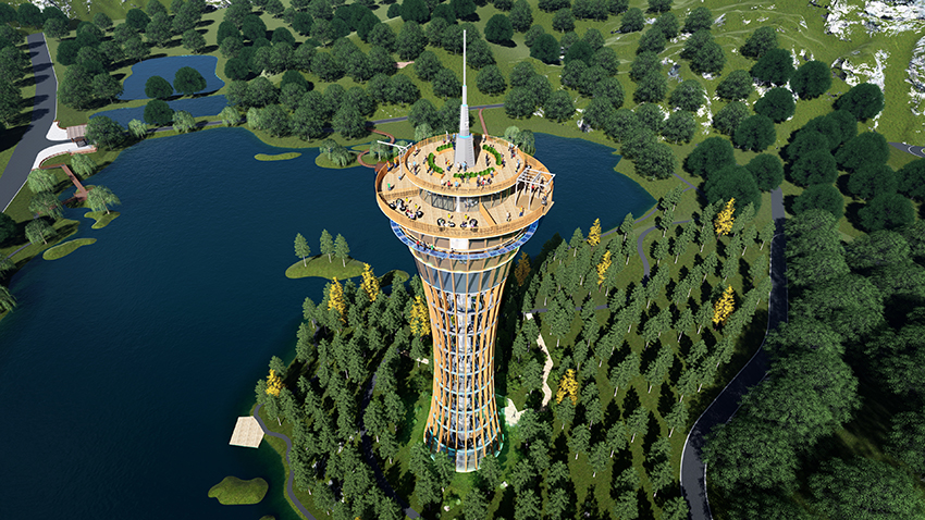 SKY DIVE空中樂園,景區地標性高塔,高度約100m,集觀光、高空娛樂、餐飲、于一體。